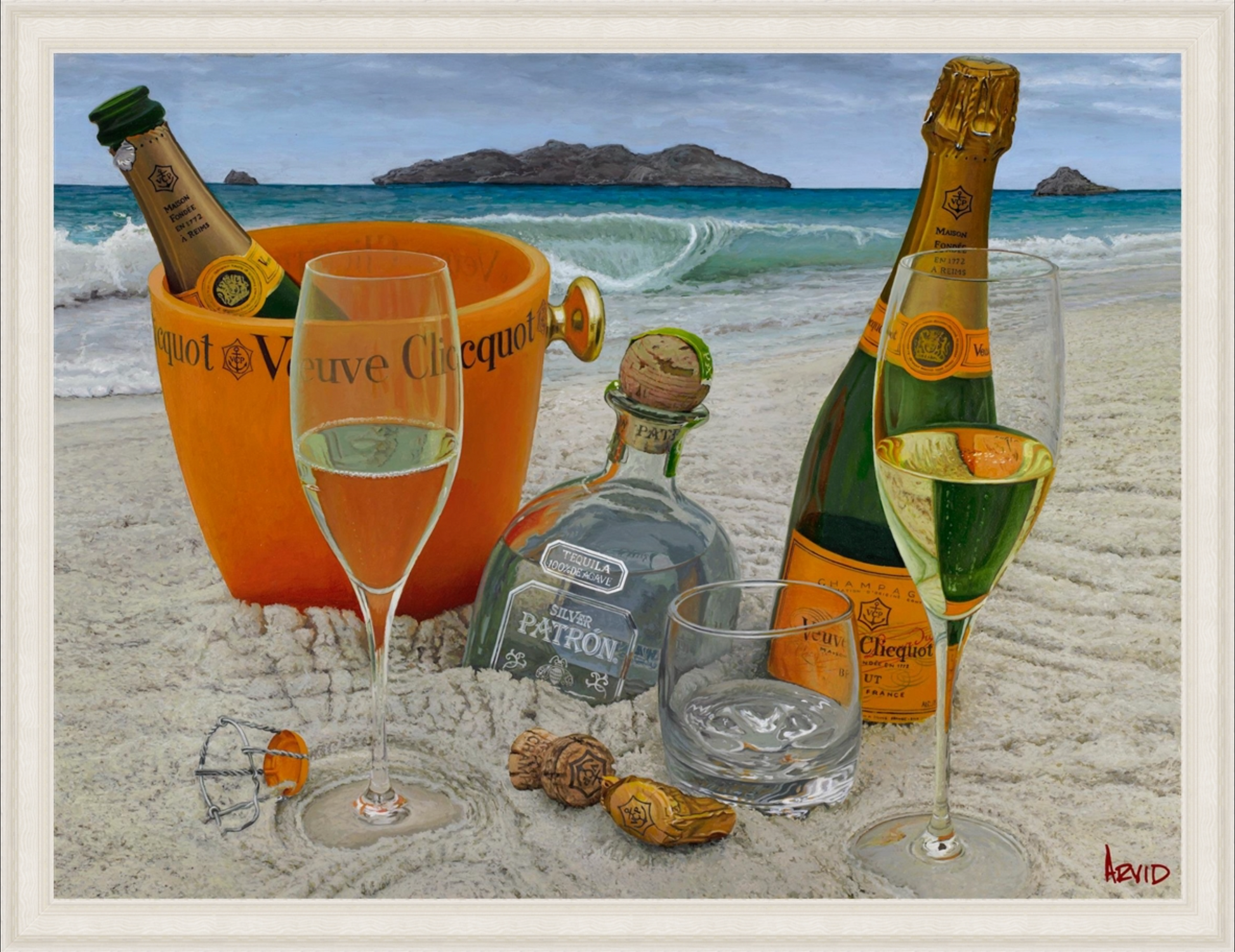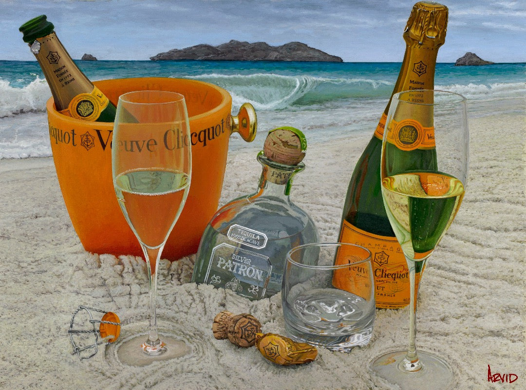 Arvid believes in living artfully, whether crafting a fine dinner for friends and collectors, or restoring an old wood boat, he puts detail and passion into everything he does. He also believes in embracing life to the fullest and in living as if it’s an adventure. Thus, when he had the opportunity to move his family to Maui, he seized it immediately. While on the island, the family fully immersed themselves in the beach lifestyle, surfing together, diving together, and, most importantly, chasing sunsets together. Inspired by the crystal turquoise waters and the cerulean blue skies of the island, Arvid has threaded more blue into his paintings, and in this case, uses those blues to transport us to “Somewhere on a Beach.”