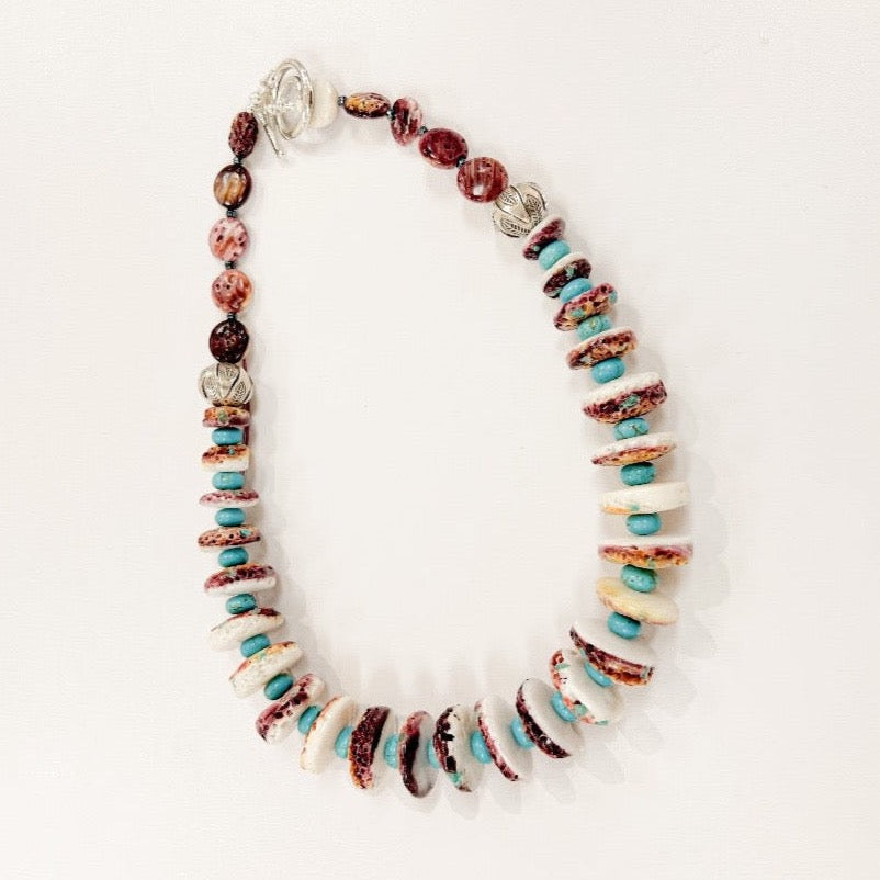 Carved natural spine lobster beads, mixed with natural turquoise, sterling silver accents and clasp by local jeweler Nancy Neeb.