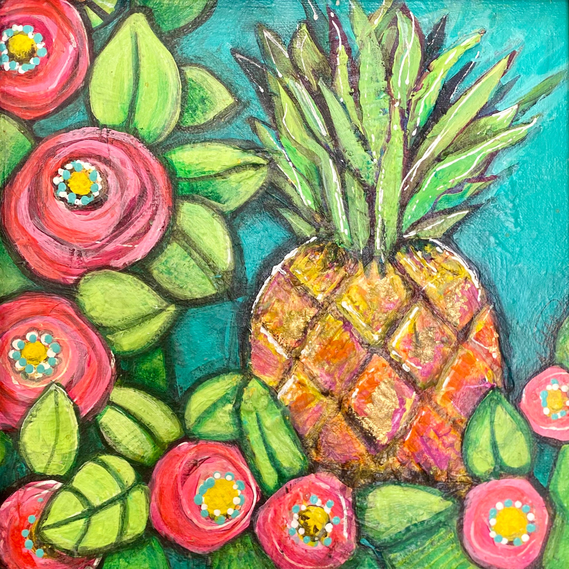 12" x 12" original mixed media on canvas by local artist Heather Wolynic. Created with acrylic and gold leaf, Wolynic paints with emotion and color. Her work blends whimsy and surrealism to create a one of a kind style. Each piece has a personal meaning to the artist, represented in her stylized symbolism.
