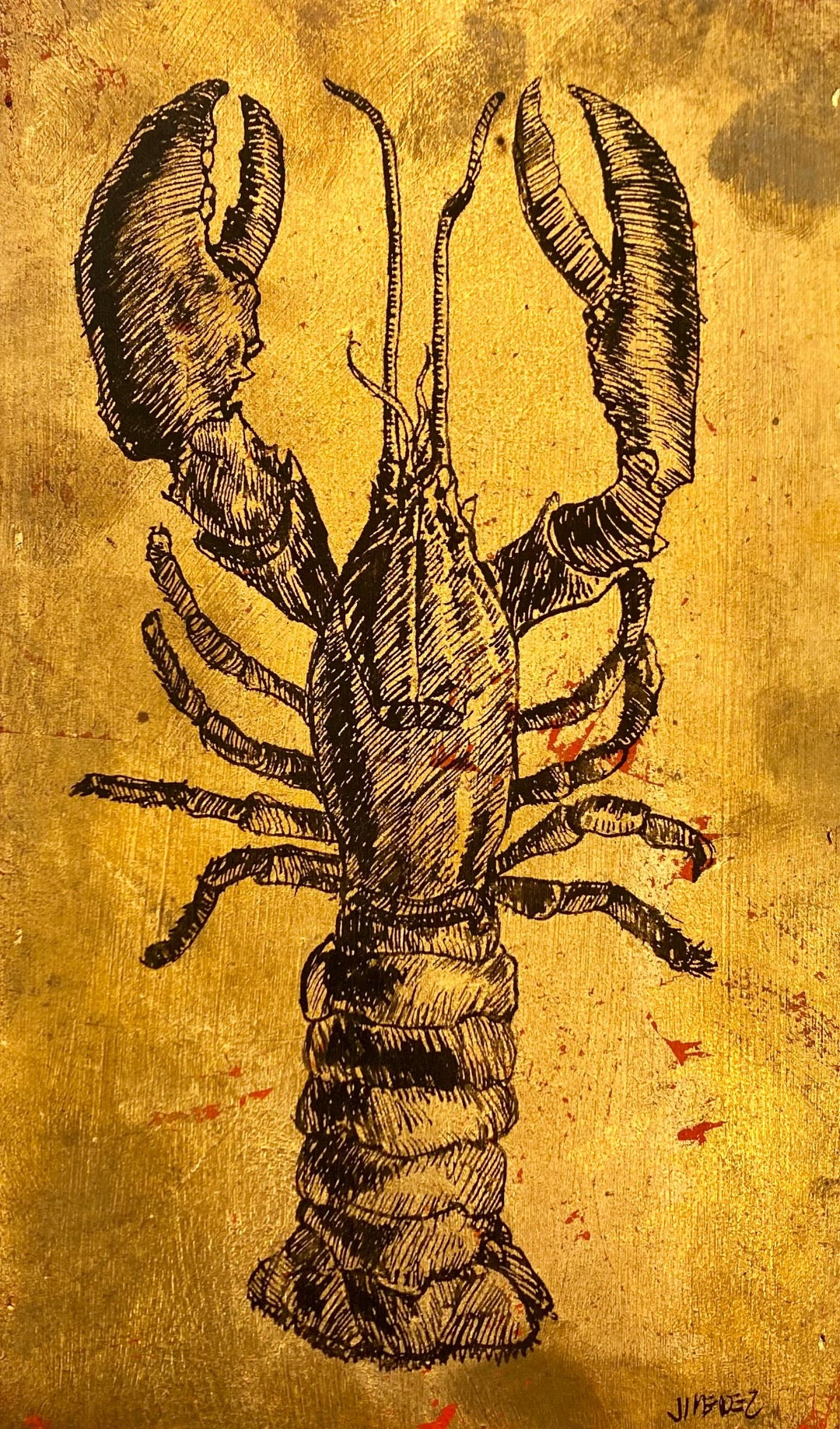 6” x 10” mixed media original by Paulo Jimenez. Transforming ordinary wood with gold leaf, into a unique creation, Jimenez eloquently detailed a lobster in the center. Notice how the red from underneath the gold leaf, peaks through the artwork. The Golden Lobster provides an uncommon take on a traditional subject. Pairs perfectly with Paulo Jimenez's The Golden Seahorse artwork.