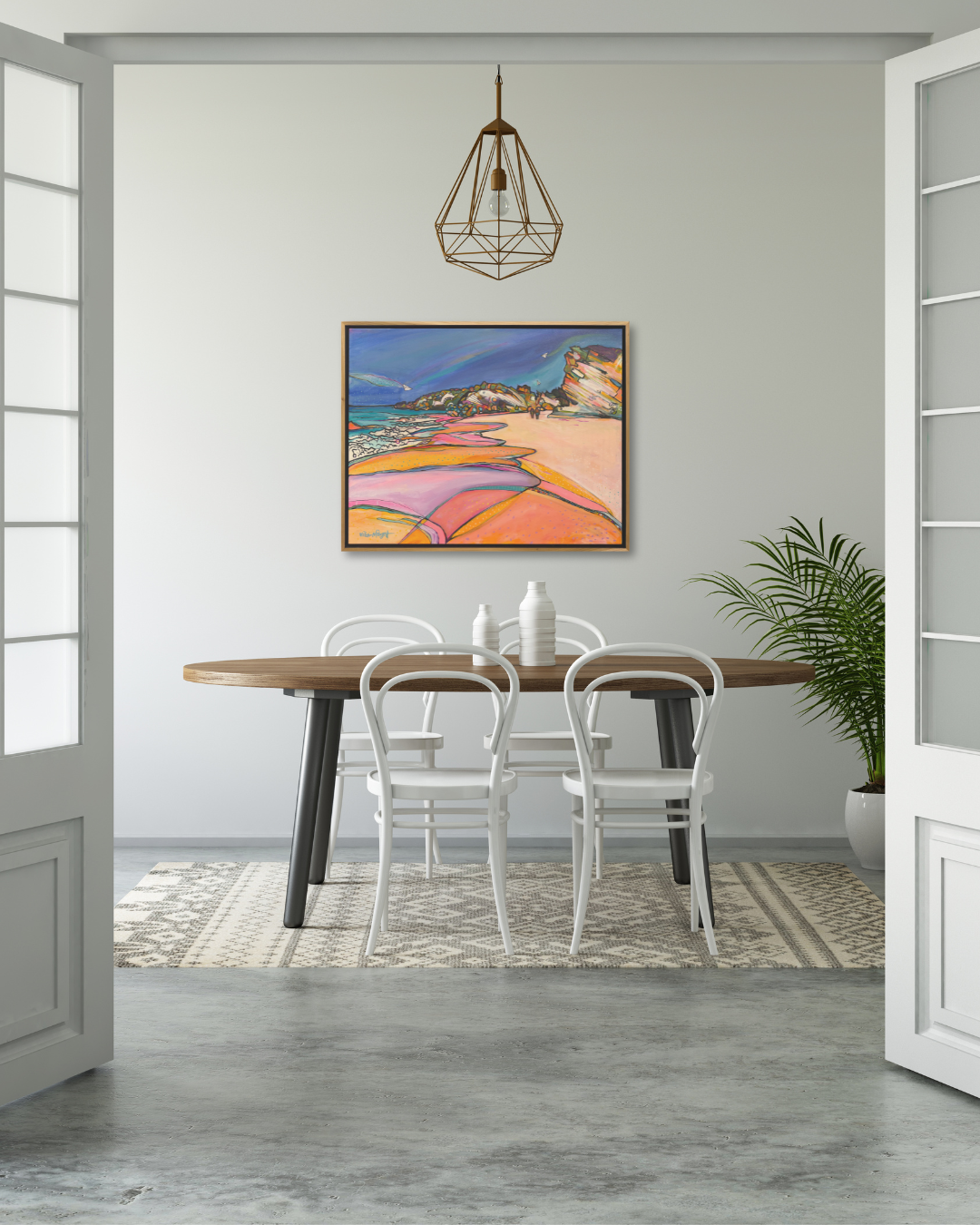 Eliza Midgett’s paintings are a celebration of color, joy, and imagination, offering a surreal escape into vibrant, whimsical worlds. Specializing in acrylics on canvas, she often incorporates humorous black & white drawings or cut paper to create her signature “Unconventional Colorscapes.” Her work transforms the beach environment she grew up in, blending reality with dreamlike elements and saturating each piece with bold, tropical hues.