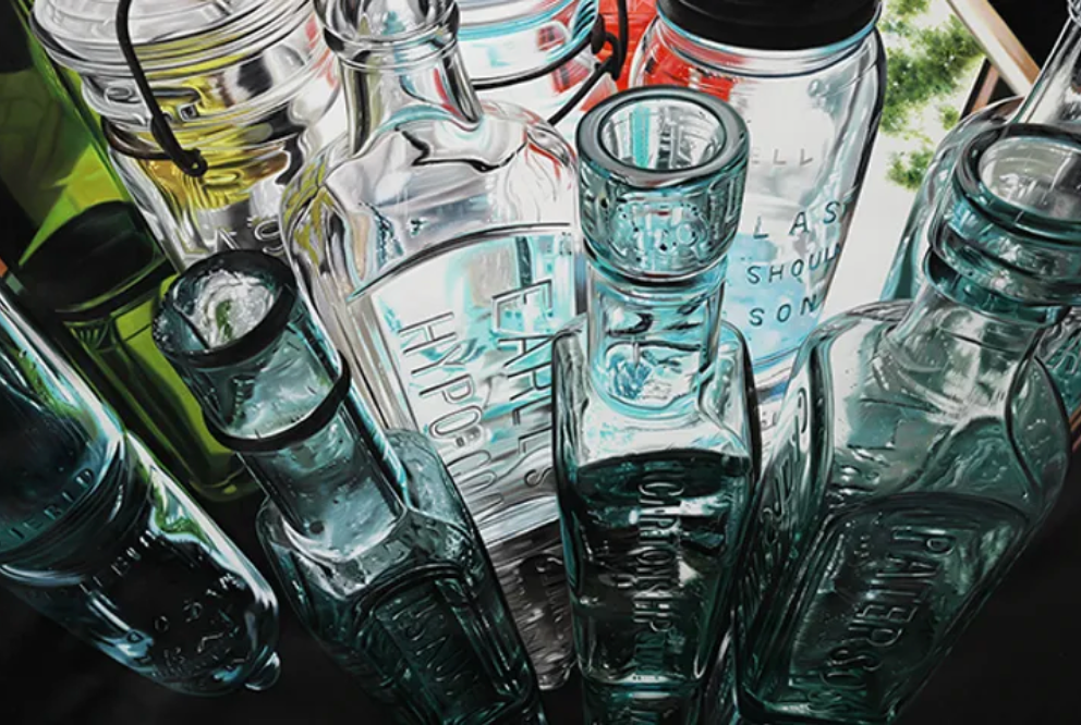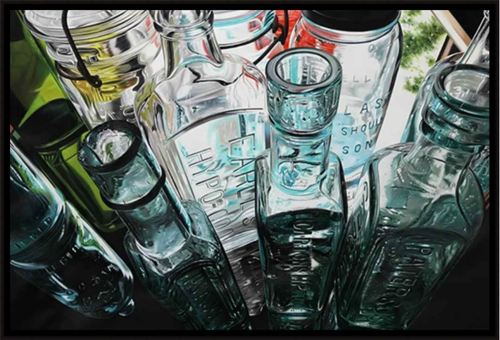 36" x 54" original oil on canvas by Ken Orton. Painted with pristine realism, Orton has mastered the skill of replicating glass and reflection in paint.