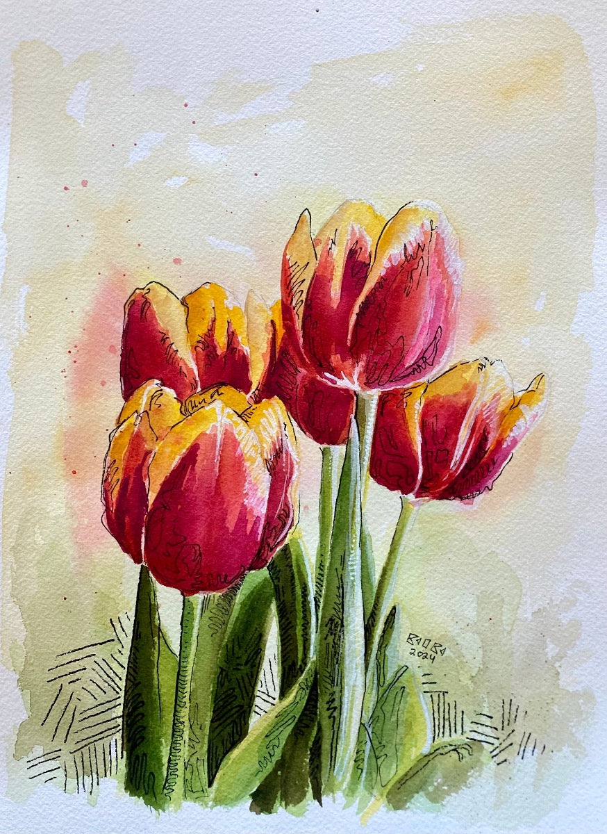9" x 12" original watercolor on paper by Katherine Knapik. Knapik pushes the boundary of the media and works with ink and pen in addition to watercolor.