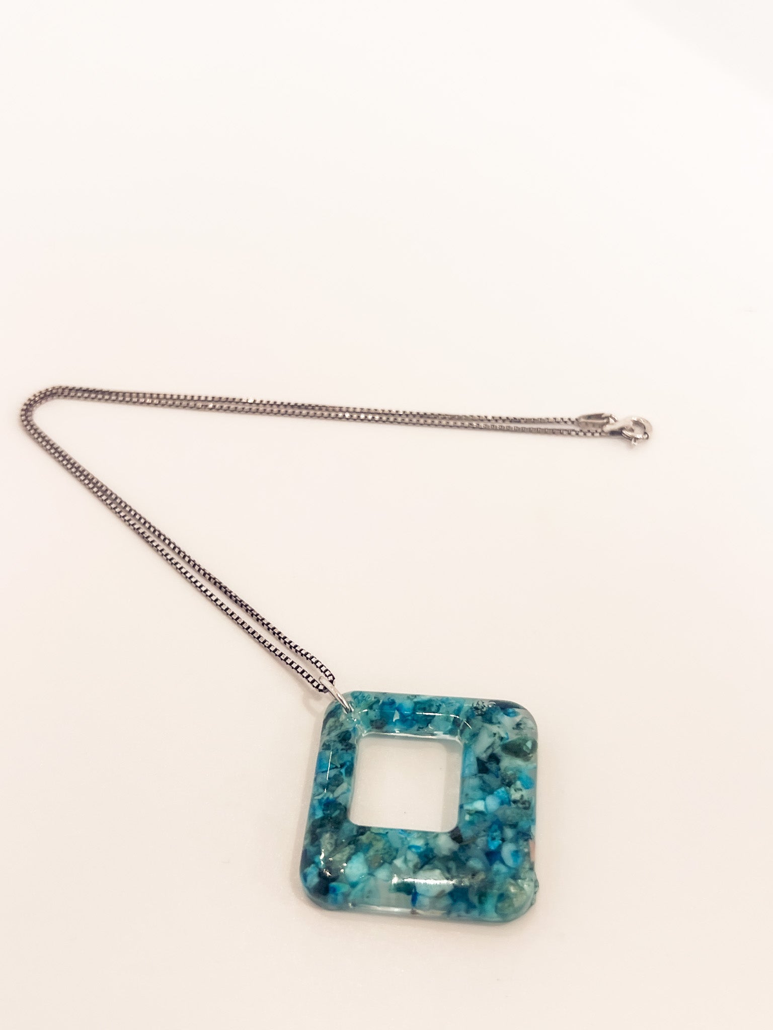 Handmade necklace by Annie Scull. Made with resin and Turquoise chips, the artist creates a one of a kind necklace.