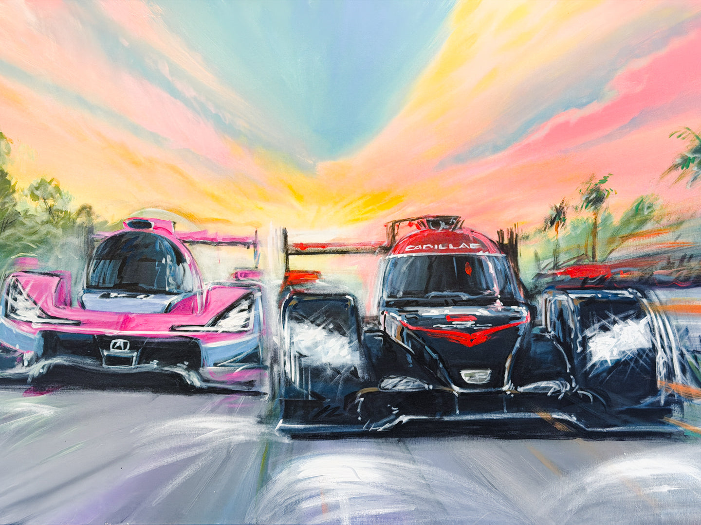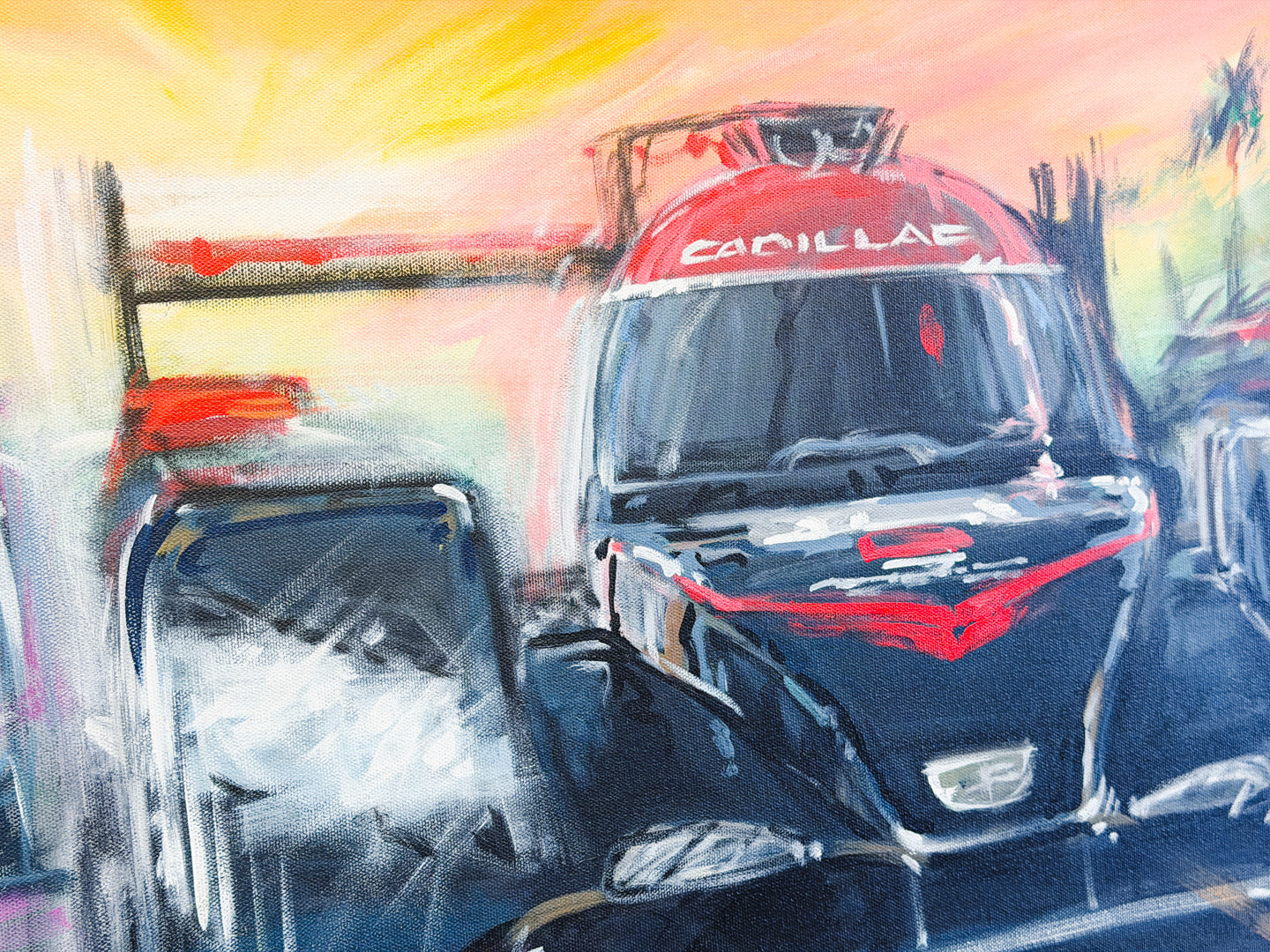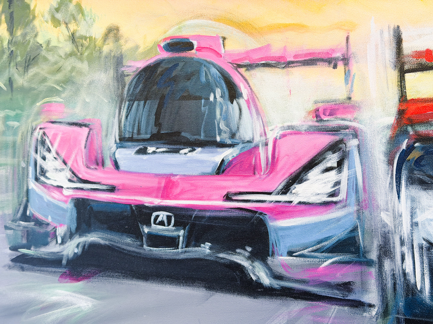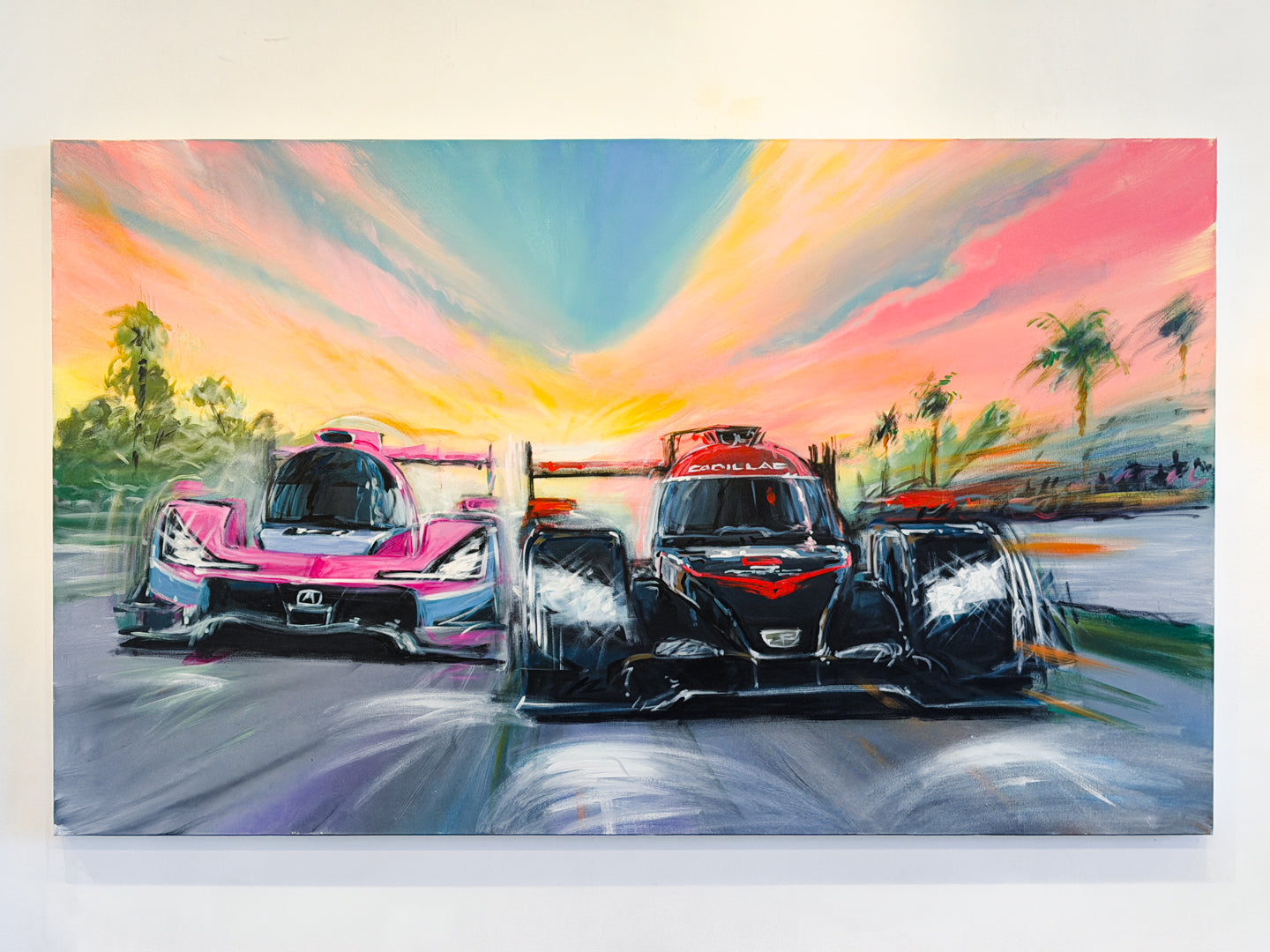 60" x 36" original acrylic on canvas by motion-sports artist Bill Patterson. What sets Bill Patterson's artwork apart is his unique painting method using long streaking brushstrokes of colorful paint to capture the motion on the track. The viewer can see and feel the speed in Patterson's paintings.
