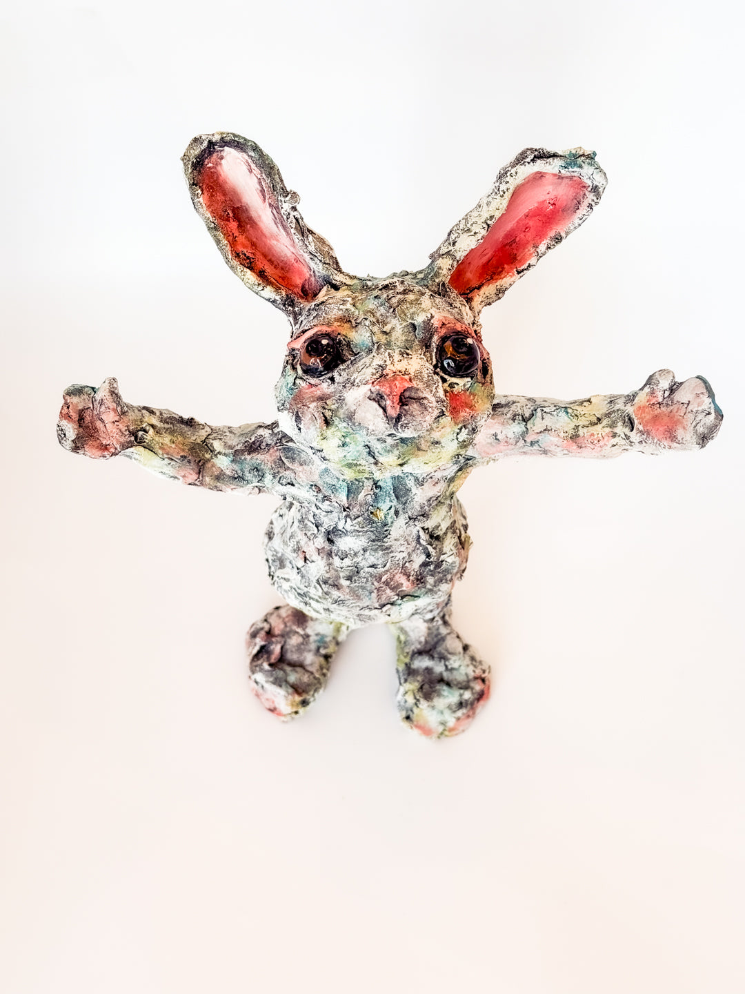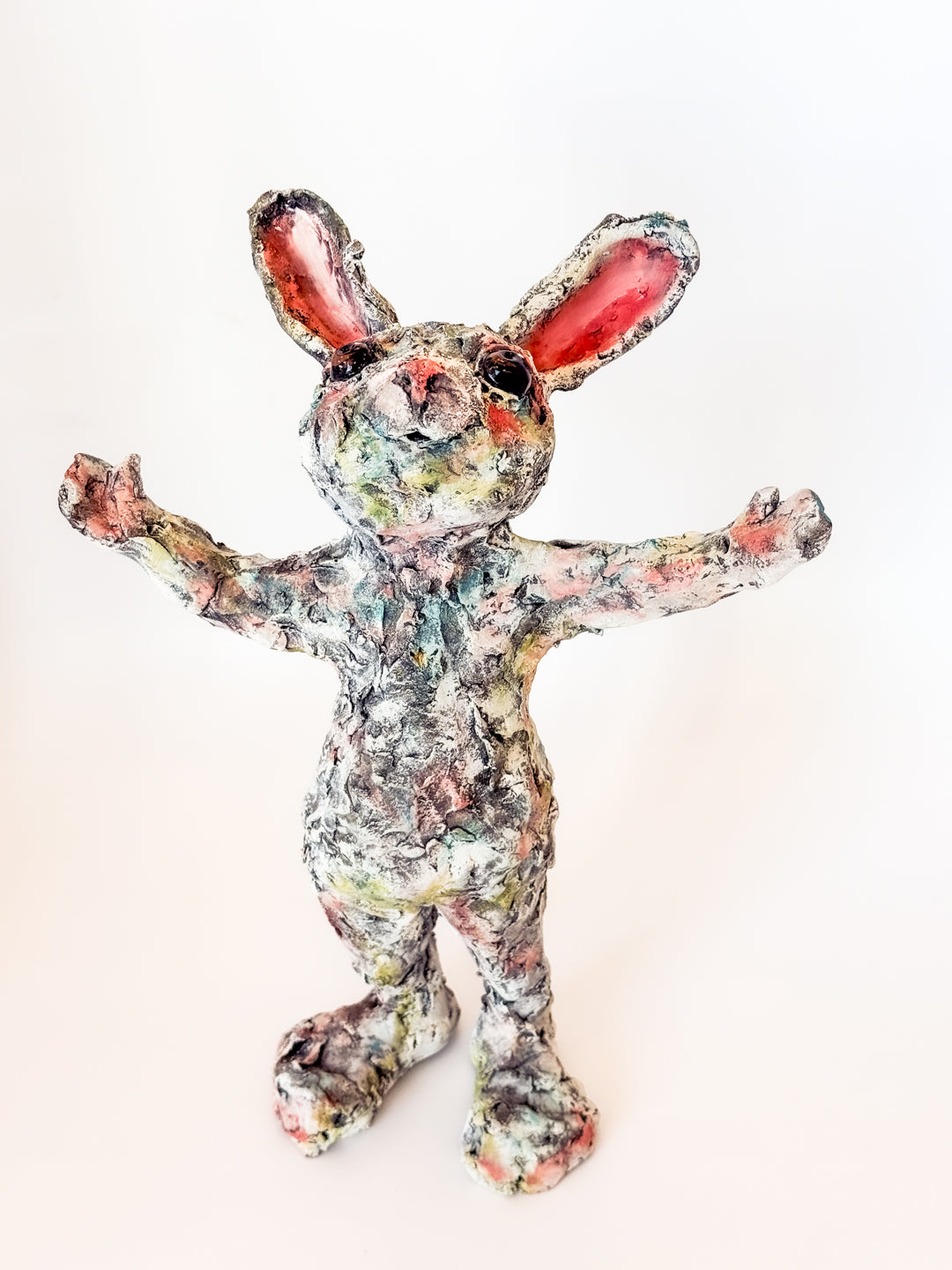 14.5" x 11" x 5" clay sculpture by Julie Latayan. Latayan's bunny is reaching upwards, looking for a hug. The artist paints each piece to give a life-like quality.