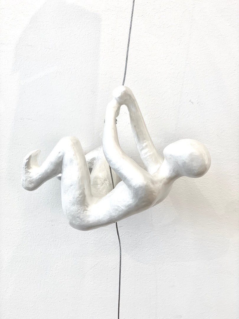 Ancizar Marin, "White Climber,” fiberglass, volcano rock and bronze sculptures finished with white automotive paint. This piece is completely hand crafted and one of a kind with Marin's signature, and represents a rock climber or acrobat climbing up or repelling from the surface of the wall.