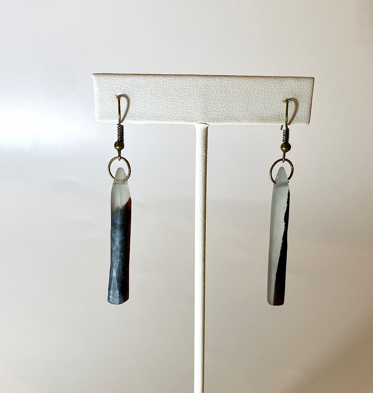 Custom wood and resin (grey) earrings by Florida artist Jeff Mishtawy. Typically, the artist creates custom wood and resin furniture, but he has created unique, one of a kind earrings just for Gallery500 collectors. Set in gunmetal earring hooks, Mishtawy uses red cedar and grey resin to create these unique dangle earrings.