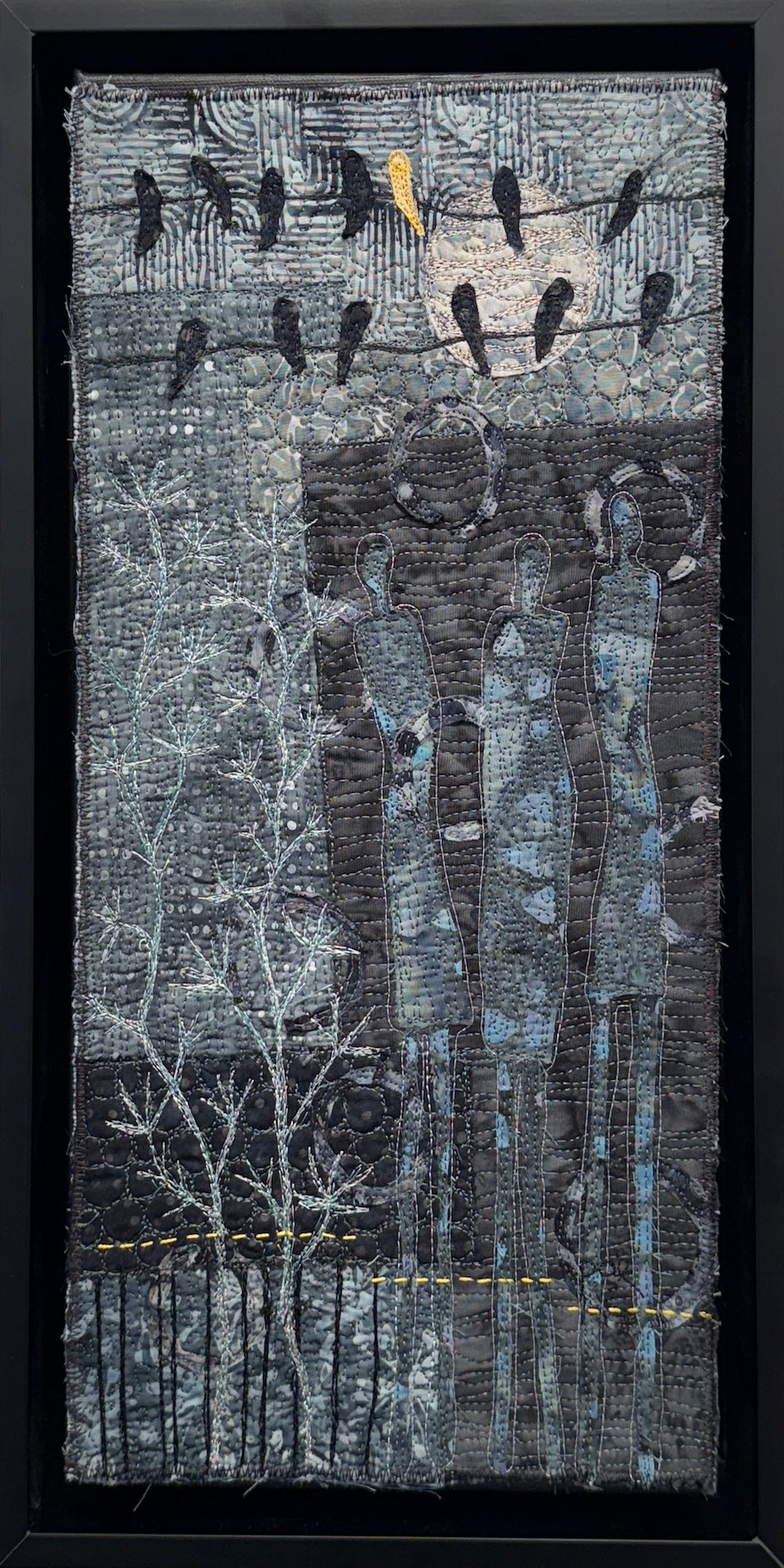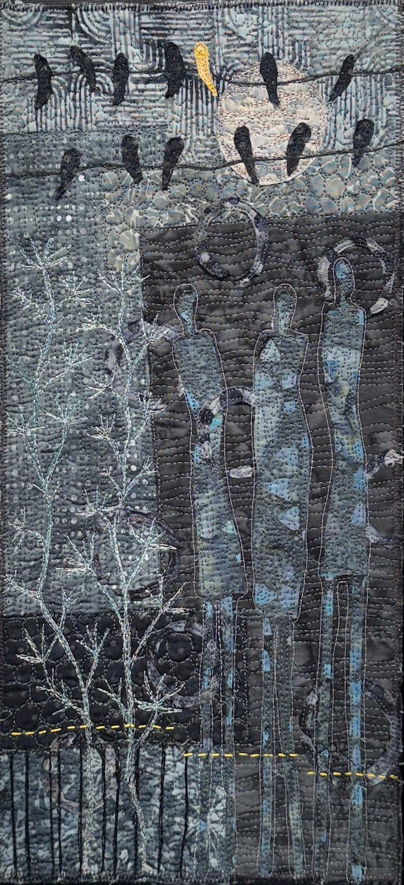8" x 16" original Fiber on canvas by Peggy Epton. The artist is a member of the Florida Women's Arts Association (FLWAA). This work is part of Gallery500's exhibition "50 Shades of Payne's Grey." In this exhibition, FLWAA members interpret the versatile color of Payne's Grey through their own individual lens and media.