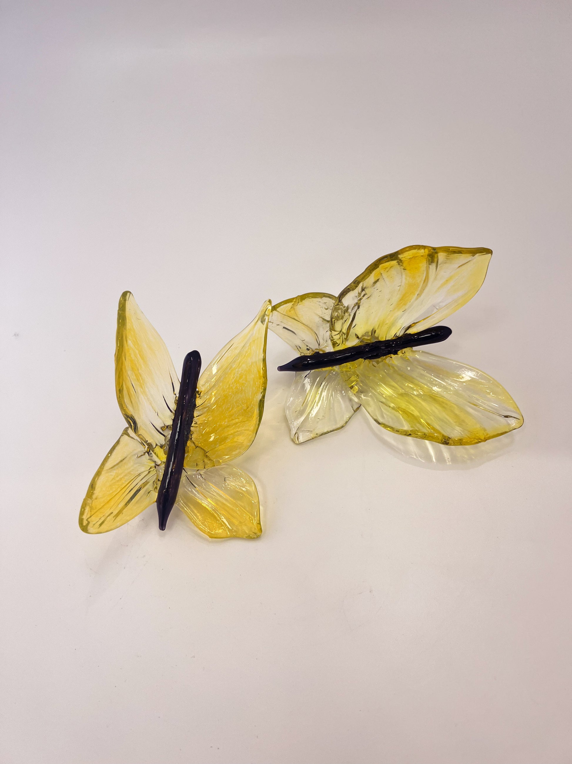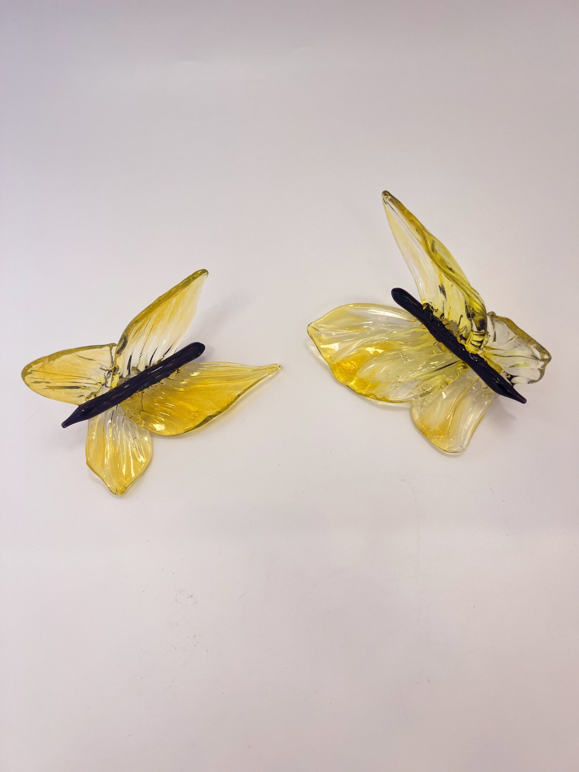 Yellow glass-blown butterfly that mounts to wall by artist Tim McFadden.